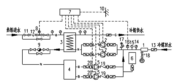 1、反沖排污過濾器2、循環(huán)泵3、換熱器4、補(bǔ)水箱5、補(bǔ)水泵6、穩(wěn)壓罐